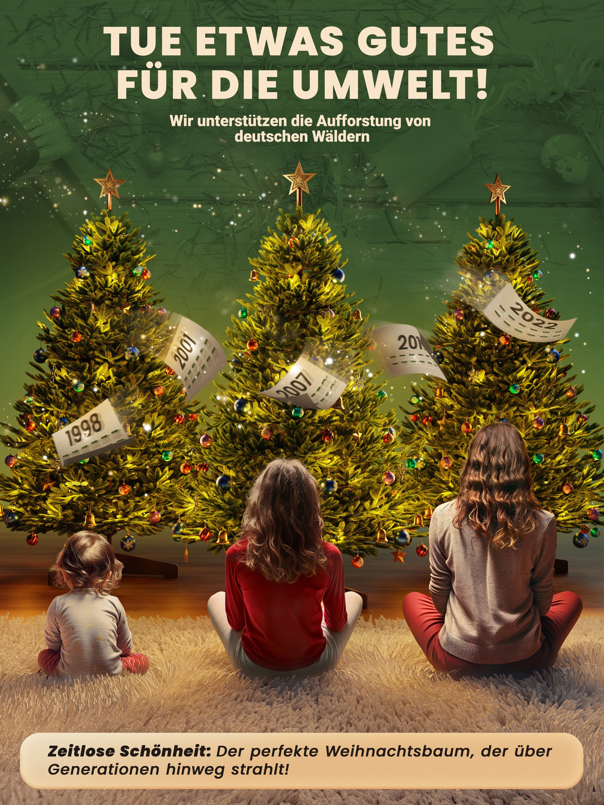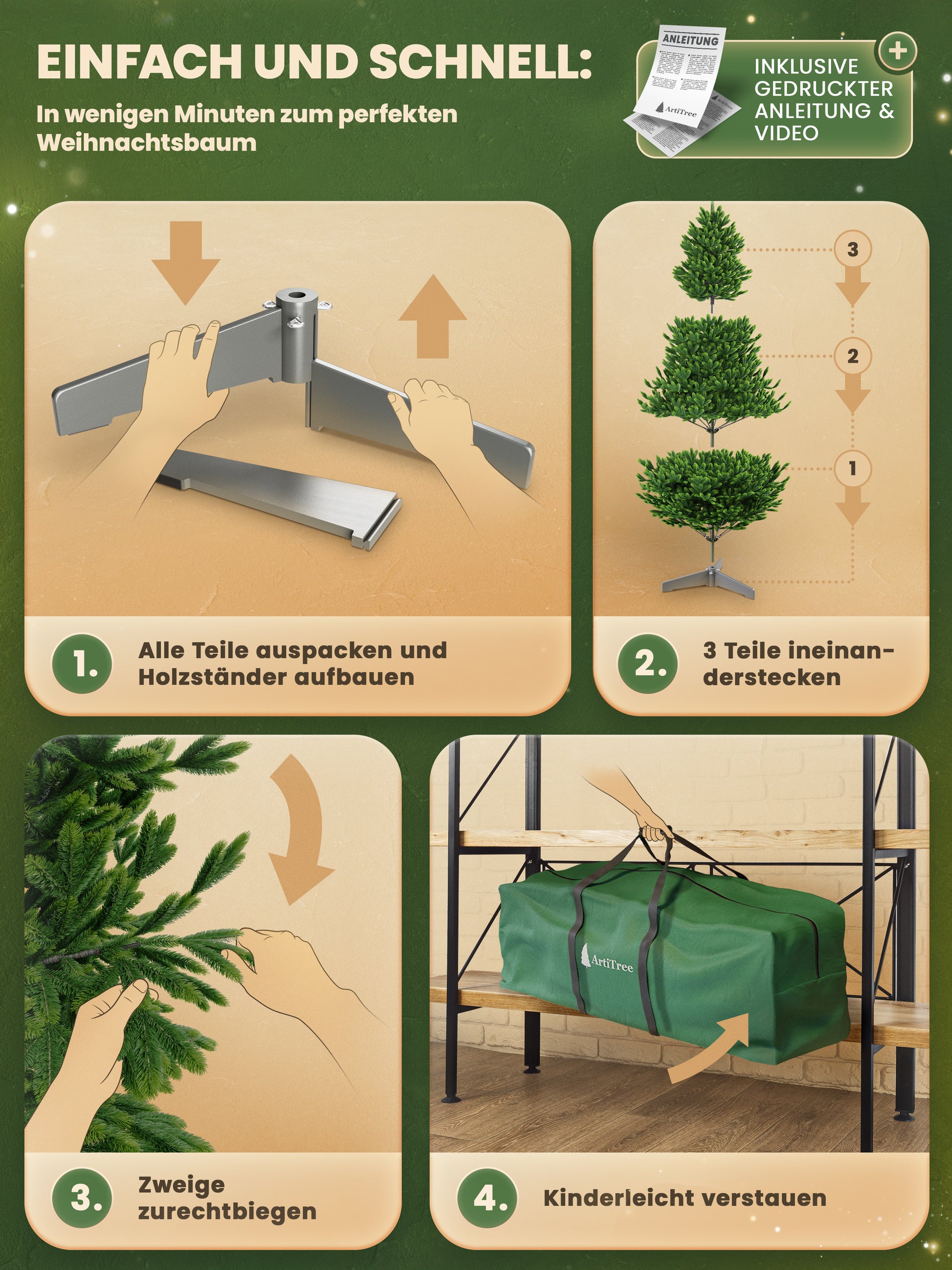 You've probably experienced this before: Many artificial Christmas trees look pretty at first glance – but upon closer inspection, you quickly notice what's missing. The top hangs limply, the trunk is simply wrapped in cheap PVC, the tree stand rattles, and the needles look artificial. Our Christmas tree is different. It's made from 100% high-quality injection-molded material and not only looks and feels deceptively real, but also feels that way. The trunk is lifelike, not simply covered in plastic, and the sturdy top securely holds your Christmas tree decorations. An FSC®-certified wooden stand ensures stability – no wobbly metal base like many other trees. You also receive a high-quality storage bag to keep your tree protected year after year. Of course, our tree is tested for harmful substances and is flame-retardant, so you can celebrate without worry. Quality you see, feel – and that lasts.